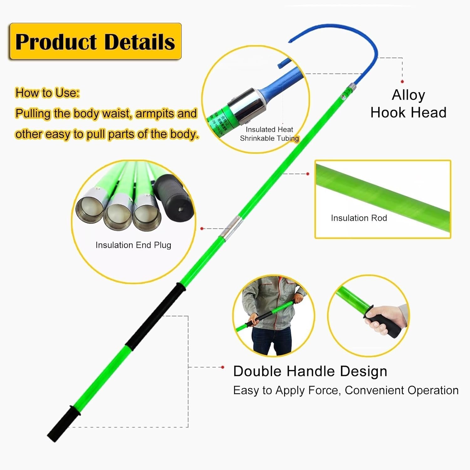 In situations where someone is incapacitated or injured due to electrocution in a hazardous area, our insulated rescue hooks are designed to safely pull the individual away from danger. These hooks can be placed under the armpits, around the waist, or other accessible areas for effective rescue. The insulated pole ensures the rescuer is protected from electric shock.Specifications:Material: Insulated EpoxyColor: Green, Yellow, RedPole Diameter: 3.2cm (1 1/4 in)Hook Diameter: 1.4cm (1/2 Inch)Function: Insulation, auxiliary safety rescue equipmentAvailable Sizes and Voltage Ratings:1m/39.4in/3.3ft (1 section) -- Suitable for 0.4-10kV.1.5m/59in/4.9ft (1 section) -- Suitable for 10-35kV.2m/78.7in/6.5ft (2 sections) -- Suitable for 10-110kV.3m/118in/9.8ft (2 sections) -- Suitable for 10-220kV.Features:- Designed for electric utility lineworkers.- Ideal for rescues in hazardous locations like confined spaces, electric and hybrid vehicles, electrical gear, and vaults.- Epoxy insulated pole with closed cell foam for electrical shock protection.- Rubber insulated handle offers reinforced protection and effective insulation.- Lightweight and compact for easy storage and quick access.- Non-slip handle design enhances ease of use for beginners and professionals alike.- Recommended to use with insulated gloves for added safety.- Durable for everyday carry and use.Package Includes:1 x Insulated Rescue HookSafety Note:Keep away from children to prevent poking risks.