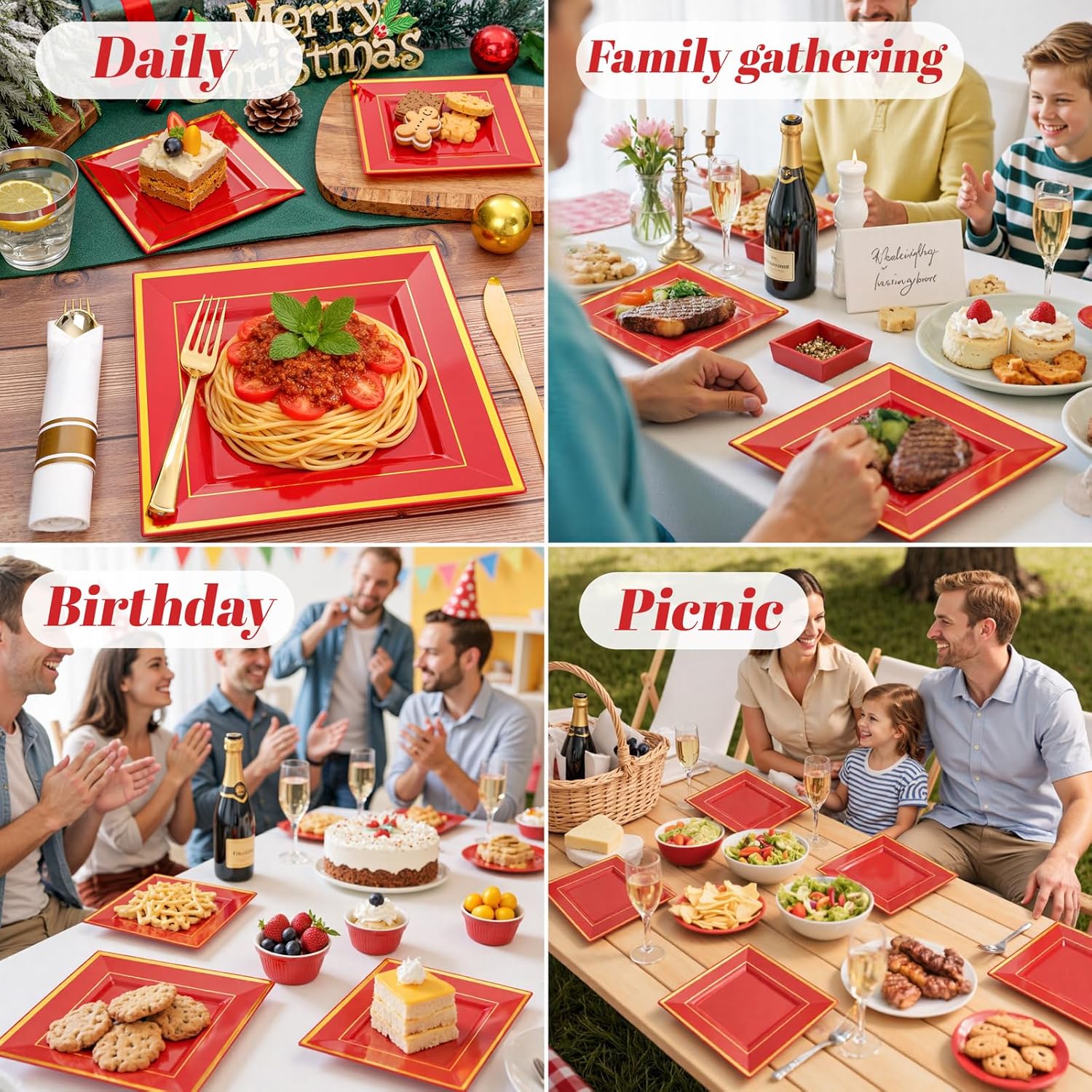 DURABLE AND HEALTHY MATERIAL:These red and gold plates are made of heavy plastic. Heavy duty materials made these plastic disposable plates solid, durable and won't scratch or break easily. These red plates are made of food grade plastic. CONVENIENT & REUSE:Don’t worry about post-party cleaning, these red plates for party will reduce your cleaning time that you will have more time to rest. We suggest you wash these red plates with gold trim by hand and dry them naturally if you want to reuse them again. WIDE RANGE OF USES:These red and gold plates ideal for serving appetizers, wedding cakes, desserts and fruit salads that requires the look of elegance. You can use these square plastic plates for Weddings,New Year , Birthday parties, Picnics and so on. FOR 50 PEOPLE:This Mothers Day plates disposable set includes 50 9.5-inch red dinner plates plates and 50 6-inch dessert/salad plates to serve up to 50 guests at a time.These red plastic square plates gold trim look very elegant. It’s a nice choice for festivals or other events. GOOD EXPERIENCE:We hope these gold rimmed plastic plates can bring you a good experience,and the gold and red plastic plates making every meal memorable and enjoyable for you and your guests.