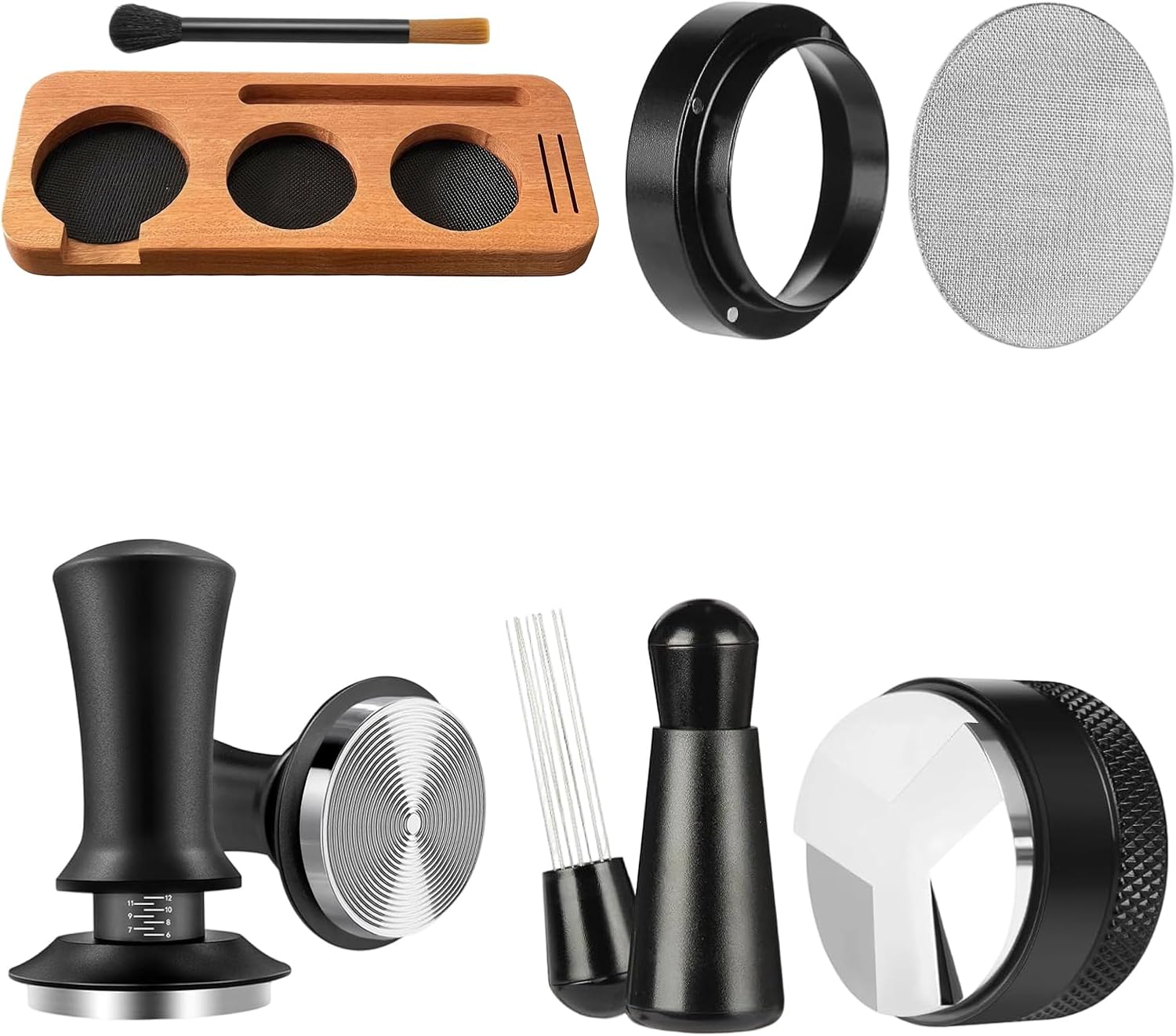 Practical Tamping Stand Espresso Machine Accessories with Espresso Tamper Coffee Distributor for Home Brewing Features: Elevates your brewing with espresso accessories set, a complete espresso set for most beginner and professional Whether in kitchen or a professional coffee counter, this set can perfectly blend in Its exterior design is not only practical, but also adds an elegant atmospheres to your coffee corner The smooth surfaces makes the process simple and fast, just gently wipe to keep it as new Perfect for most beginner and experienced baristas, it ' s the thoughtful, ready-to-gift for any coffee lover seeking to elevates their brewing This multipurpose coffee tamper distributor and stand set is suitable for various espresso machines, making it a functional option for any coffee lover ' s toolkit Specifications: Component: Wood and Metal Set: 5pcs / 7pcs Size: As Shown in the Picture Package Includes: 5pcs / 7pcs Coffee Tamper Set Note: Please allow 1-2cm errors due to manual measurement, make sure that you do not mind before you order Due to the difference between different monitors, the picture may not reflect the actual color of the item