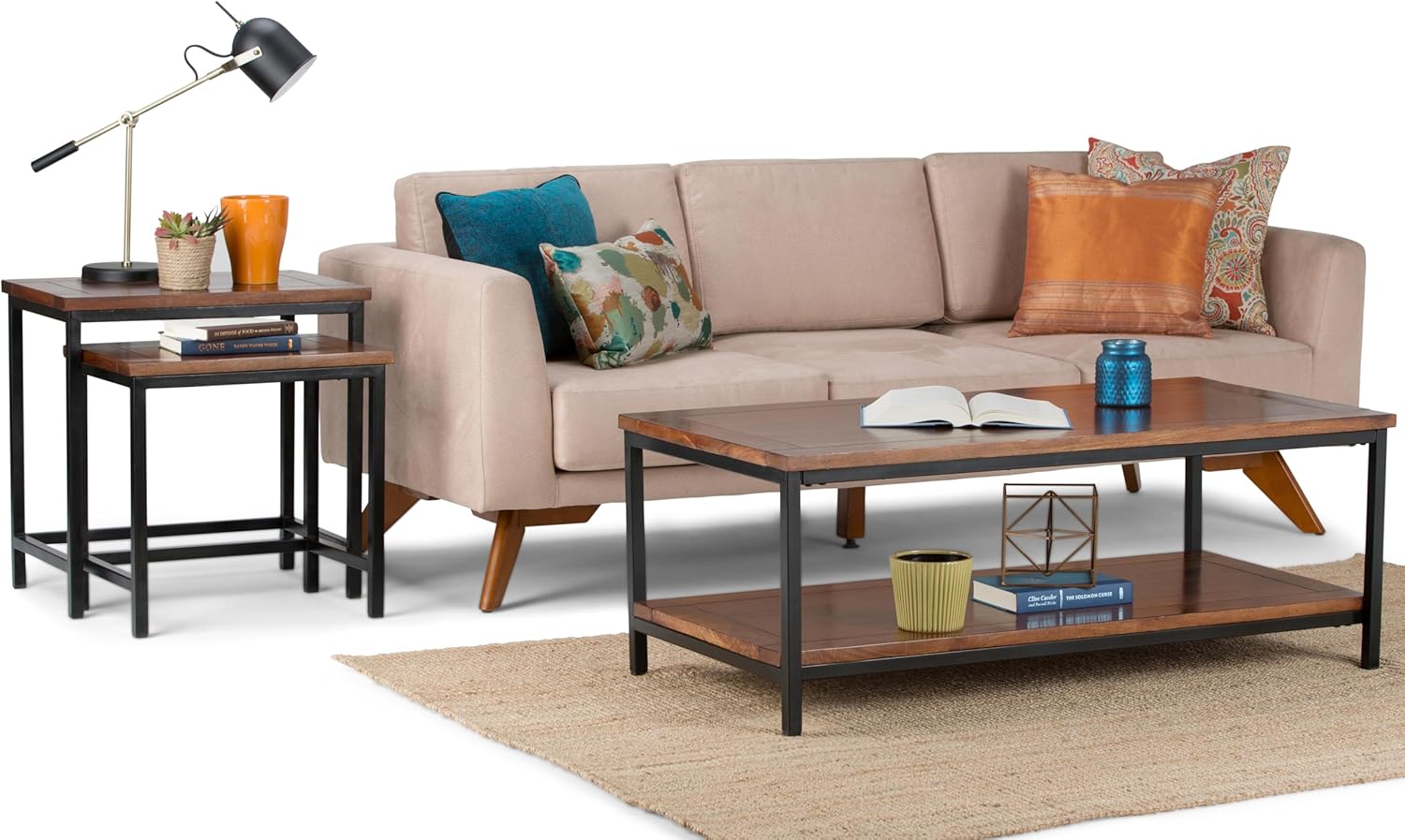 Blending industrial flair with modern versatility, the Skyler Nesting Side Table Set offers functional style for dynamic living spaces. Crafted from premium solid mango wood paired with sturdy steel, each table is finished in a rich dark cognac brown that emphasizes the wood’s natural grain. Designed to nest together to conserve space or separate for additional surface area, this set adapts easily to your needs. The black box-shaped metal bases provide a striking contrast and reliable support. Ideal for enhancing living rooms or any room, these tables arrive ready to use and complement contemporary, eclectic, or urban loft interiors.