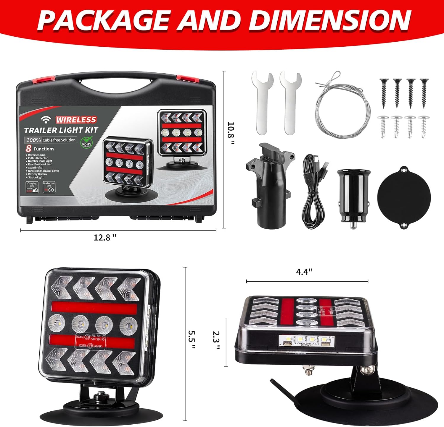 USB-C Wireless Trailer Lights Kit with Reverse, IP67 Waterproof Magnetic LED Tow Light for Towing, Tail, Brake, Turn Signal for Car, Boat, Camper, RV (B-Type)