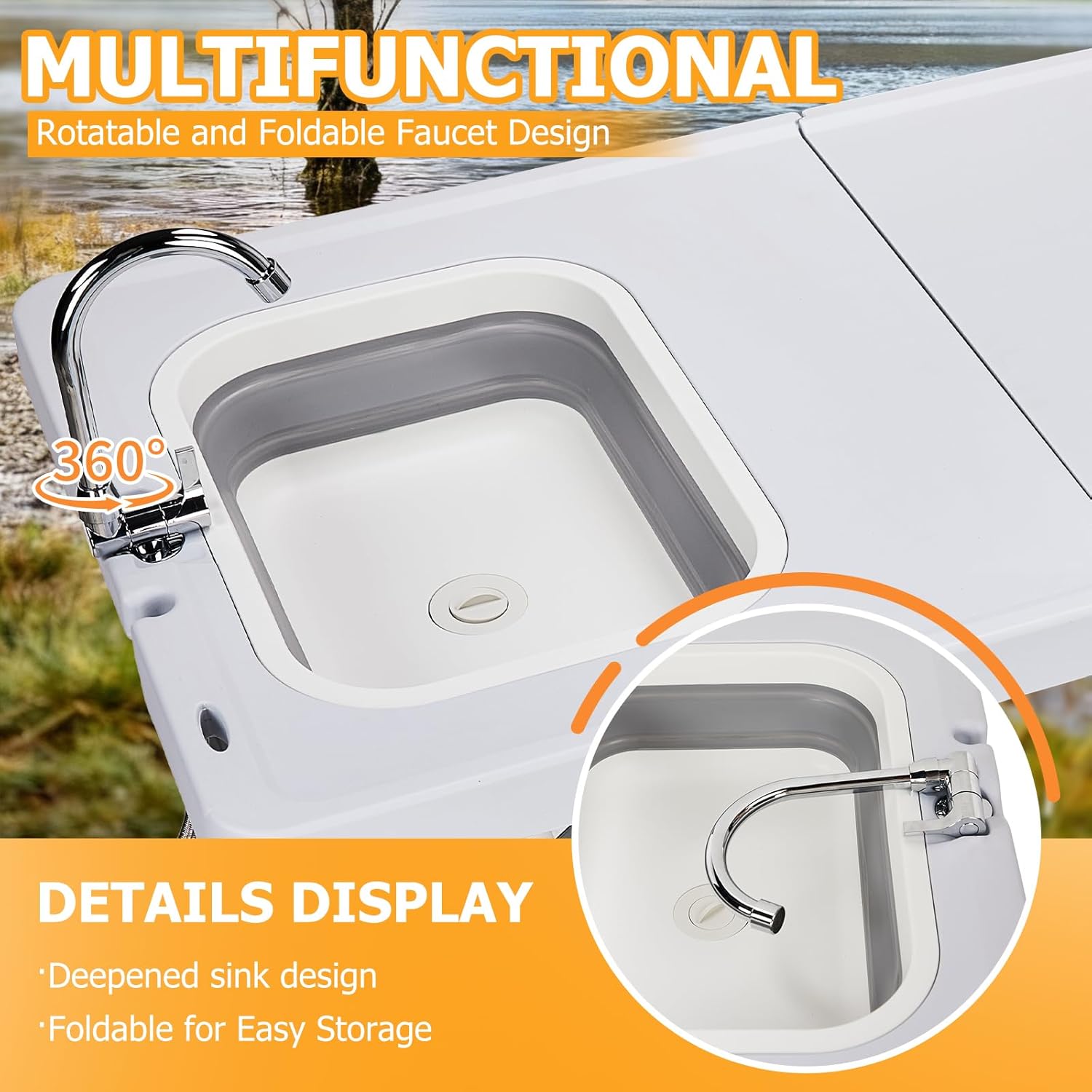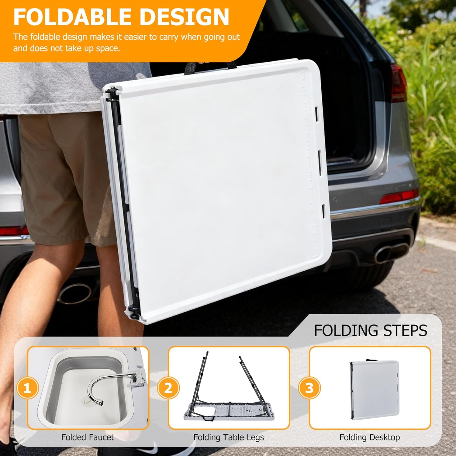 Introductions: This folding fish cleaning table is a complete outdoor sink station designed to make food prep and cleanup easier in outdoor settings. It features a large bi-folding tabletop with a built-in sink, supported by a reinforced frame with lockable legs for dependable stability. Ideal for anglers, campers, hunters, and outdoor cooking enthusiasts, this table works well at campsites, fishing spots, backyards, and tailgate gatherings. The integrated sink system connects to a standard garden hose, allowing convenient washing of fish, food, or utensils on site. With its portable design and included storage bag, the table is easy to transport and store. Built from durable materials, it offers a sturdy, reliable workspace for repeated outdoor use while remaining lightweight and user-friendly. Features: 1. All-in-One Sink Station: Combines a built-in sink, folding faucet, drain hose, trash bin, and storage bag to handle fish cleaning and food prep in one organized setup. 2. Heavy-Duty Stable Structure: Reinforced frame with lockable legs provides solid support for cleaning, cutting, and washing tasks, even on uneven ground. 3. Large Folding Work Surface: Features a spacious tabletop that offers plenty of room for fish cleaning or meal preparation and folds down compactly for storage. 4. Portable and Lightweight Design: Weighing only 28 lb, the bi-folding table is easy to carry, transport, and store in a car, RV, or garage. 5. Durable Outdoor Materials: Made with a blow-molded HDPE tabletop and a crack-resistant drain hose, designed for long-term outdoor use and reliable performance. Specifications: 1. Expanded Dimensions: (50 x 27 x 36) in / (127 x 68.5 x 91.5) cm 2. Folded Dimensions: (27 x 25 x 4) in / (68.5 x 65 x 11) cm 3. Tabletop Size: 50 x 27 in 4. Weight: 28 lb 5. Material: HDPE plastic tabletop 6. Color: White tabletop with gray legs Package Includes: 1 x Folding Fish Cleaning Table 1 x Instruction Manual 1 x Folding Faucet 1 x Foldable Trash Bin 1 x Storage Bag