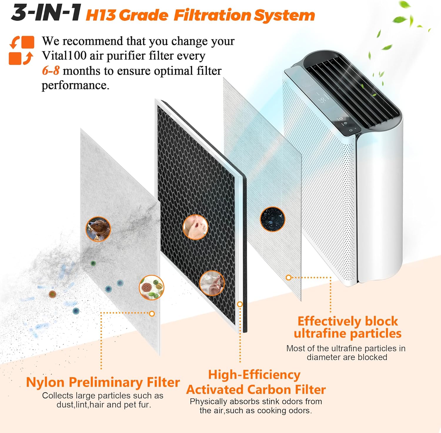 | Material Type | Air purifier filter levoit vital 100-rf vital 100 features a honeycomb activated carbon filter layer that increases contact with the air to absorb household odours faster and more effectively, The Vital 100 replacement filter element is made of high-quality non-woven fabrics and activated carbon, with low energy consumption and low-density structure technology, which has higher efficiency and lower pressure to ensure maximum filtration, Vital 100 levoit air purifier filter H13 true filters for levoit air purifier, are made of quality non-woven fabric MERV 17 material, and constructed to the highest standards to reduce air resistance and improve airflow |