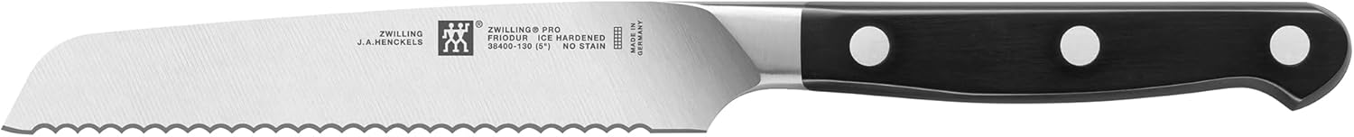 ZWILLING Pro is the most user-friendly knife available to market. The unique blade shape and ergonomic bolster are the result of 280 years of experience in knife making, and the rigorous study of how knives are used. A unique curved bolster supports the professional pinch grip, with thumb and index finger on the blade, for safe cutting and less fatigue. The blade was redesigned with a broader curve in the front to facilitate the rocking motion of Western cutting, while the straight back is ideal for the Asian chopping motion. The full length of the blade can be used when cutting and can be sharpened from bolster to tip Designed in Italy by Matteo Thun and made in Germany by ZWILLING J.A. Henckels, the company that sets the standard for exceptional cutlery worldwide. Set includes 4" Paring Knife, 5.5" Fine Edge Prep Knife, 8" Traditional Chef's Knife, 8" Bread Knife, Kitchen Shears, 9" Sharpening Steel, 2-Stage Sharpener and 16-slot ZWILLING Pro Hardwood Knife Block.